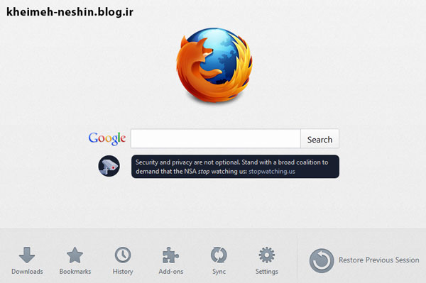 تصویر صفحه آغازین مرورگر Mozila Firefox و هشدار امنیتی درباره جاسوسی NSA